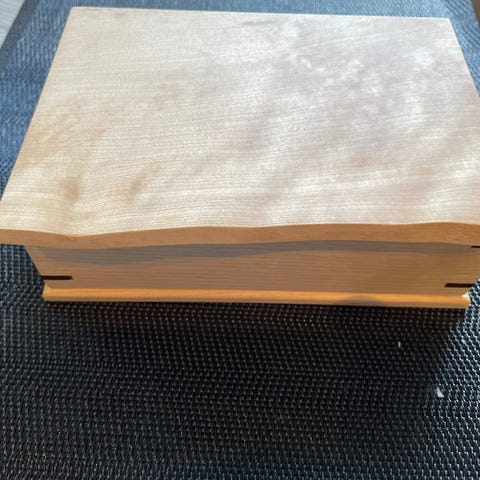 Vinflaskeholder i form av en treboks i naturfarget tre. Boksen har plass til én vinflaske og har utsparinger i lokket som kan brukes til å feste eller støtte flasken. Den har hengslet lokk, metallbeslag og et håndtak på toppen for enkel bæring. Egner seg til oppbevaring eller servering av vinflasker, samt som dekorativ oppbevaringsboks.