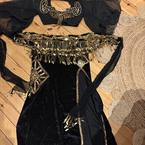 Fin magedansdrakt med en frisk splitt . Fargen er brun med glinset sjattering i blå/grønn . Valgfritt stykke foran navlen . Hodeplagg av perler . Str.S/M
