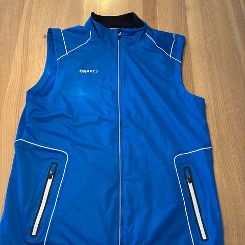Craft Pro Running løpevest for herre i størrelse XL. Vesten er i lys grå farge og har lett vattering i front og øvre del av ryggen. Glidelås i full lengde foran. Baksiden har perforert stoff for bedre ventilasjon, samt en glidelåslomme nederst på ryggen for oppbevaring av småting. Elastisk kant nederst for bedre passform. Egnet til løping og annen trening utendørs i kjøligere vær.