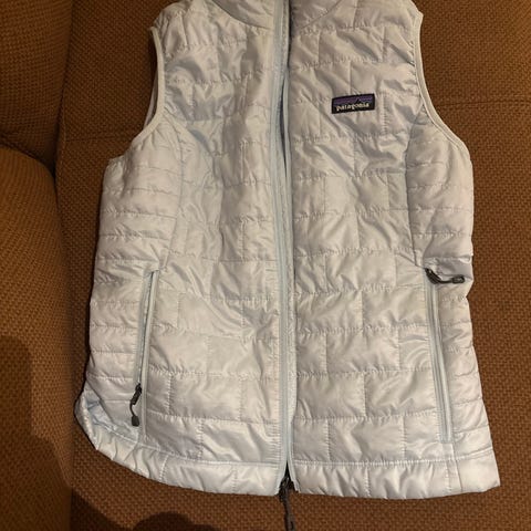 Patagonia vest for dame i størrelse S. Vest i grå farge, laget i polyester. Modellen har høy krage og gjennomgående glidelås foran. Vattert konstruksjon med horisontale sømmer gir jevn fordeling av isolasjonen. To sidelommer med glidelås. Egnet som mellomlag eller ytterplagg i kjøligere vær.