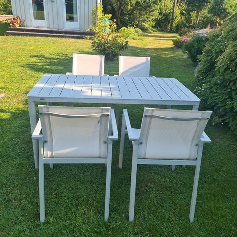 Møblene er svært lite brukt og fremstår som pent brukt. Har vært oppbevart under tak gjennom alle sesonger.