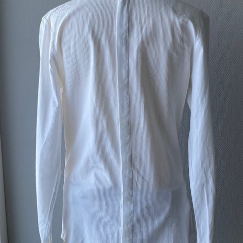 Lacoste skjorte for herre. Skjorten er hvit og laget av bomull. Den har lange ermer, klassisk krage og knepping i front. Diskré logo på brystet og liten merkedetalj nederst på skjorten. Skjorten er brukt, gulnet litt i kragen og har en liten flekk på ermet som kan gjemmes under jakken. Prisen er nedsatt tilsvarende.