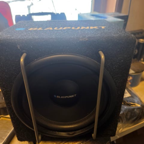 Selger min basskasse med forsterker og fullt koblet ledninger. Er bare og putte inn og koble til stereoen. Litt usikker på antall watt lyd men virker veldig bra. Kjøpte ny bil og den passet ikke inn.