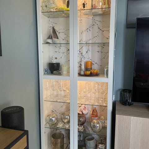 Selger et vitrineskap kjøpt fra IKEA i august 2025. Skapet har ingen synlige skader og fremstår som nytt. Pent brukt og godt vedlikeholdt. Innholdet på bildet, følger ikke med.