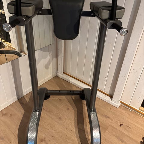 Dips og benhevstativ i grå metallkonstruksjon med polstrede armlener og ryggpute. Stativet er frittstående med bred fot for stabilitet. Egnet for øvelser som dips, benhev og lignende kroppsvektstrening hjemme eller på mindre treningsrom.