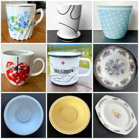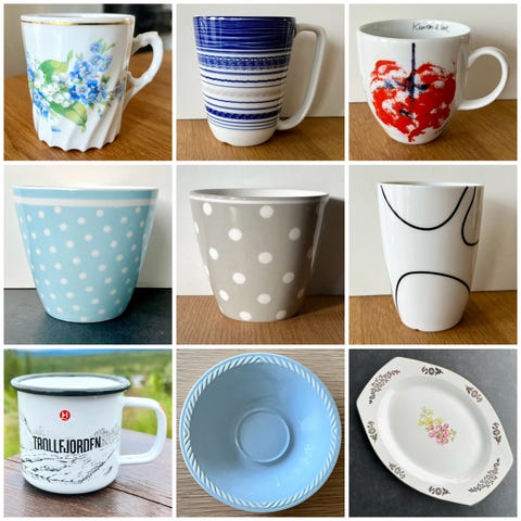 Kopper og skåler fra Porsgrund Porselen, Wik & Walsøe, Green Gate, Menu, Hurtigruten og Figgjo. Kan hentes i Heggedal, i Asker, i Sandvika eller kan sendes mot betaling av porto. Se gjerne flere bilder av tingene i egne annonser for hver ting.
