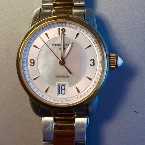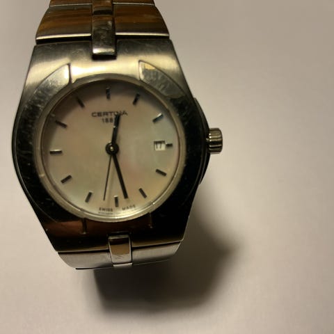 Certina dameklokke med kronograf og datovisning. Urkassen er i metall med polert finish. Lenken er i stål med foldespenne merket Certina. Baksiden av urkassen er merket med Certina-logo og informasjon om vannbestandighet. Klokken passer til både hverdagsbruk og mer formelle anledninger.