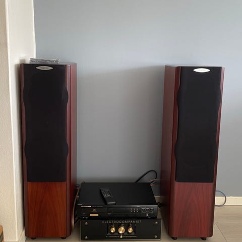 De gulvstående høyttalerne har flere elementer i hvert kabinett, med bassrefleksport i front.