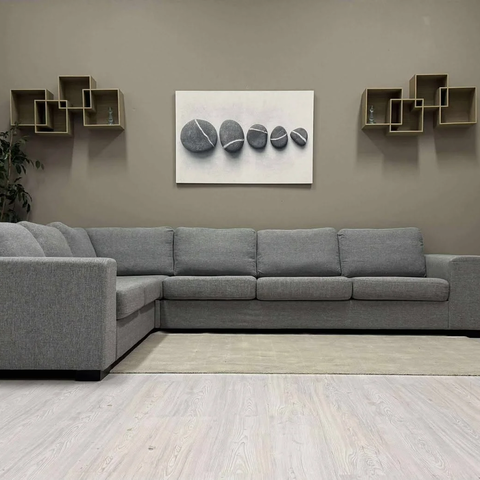 SUNDAY Hjørnesofa/ u-sofa med sjeselong, grå med svarte treben. Vendbar, putetrekk kan taes av og vaskes ved behov.