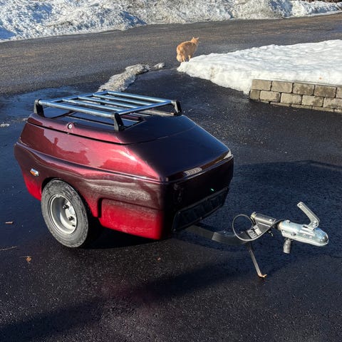 Dette er en 2002 modell EZS henger med egenvekt på 57 kg og maks totalvekt på 150 kg. Altså 93 kg. nyttelast. Så dette er godt innenfor sykkelens tillatte hengervekt. Henger er 168 cm lang med bredde på 81 cm. Sidehengslet topplokk. Hengeren har fått ny pakning rundt lokket, og nytt elektrisk annlegg, samt har fått montert lys innvendig med egen bryter. Nye dekk og felger, og nye hjullagre montert i 2024.