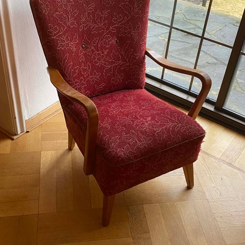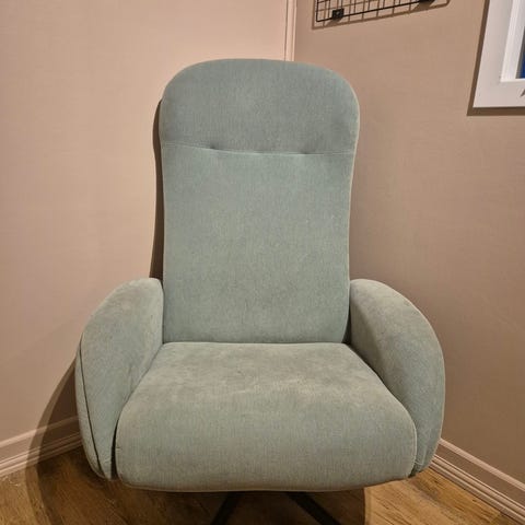 Denne stilige grønne svivelstolen har et klassisk design med høyt polstret rygg og armlener, perfekt til lesekrok, kontor eller stue. Stoffet er mykt , svart metallbase med hjul gir god bevegelighet. Komfortabel og robust, passer mid-century eller vintage-stil. Selges som den er - hentes i Stavanger.