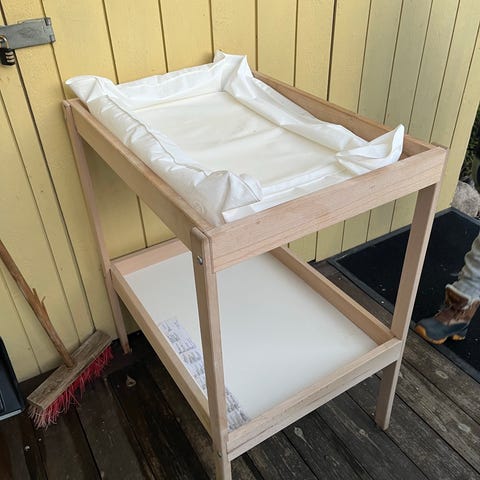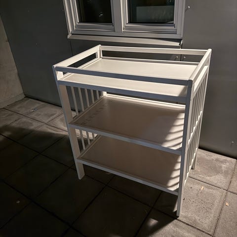 IKEA stellebord. Stellebordet har en opphøyd kant øverst til stellematte og to åpne hyller under til oppbevaring av bleier, klær og annet utstyr. Egnet til bruk på barnerom eller bad. Bruksmerker forekommer, se bilder. Må hentes raskt.