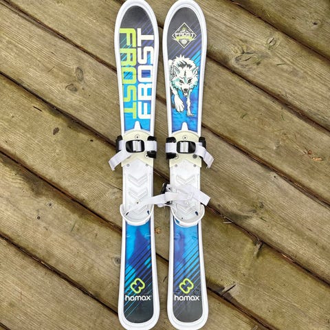Snowracer barneski i blå farge med integrert binding. Skiene har plastbinding med fotplate og metallbøyle foran og bak for å holde støvelen på plass. Egnet for barn som vil ha enkle ski til lek og lett kjøring. Skiene brukes sammen med vanlige vintersko eller støvler som passer i bindingen.