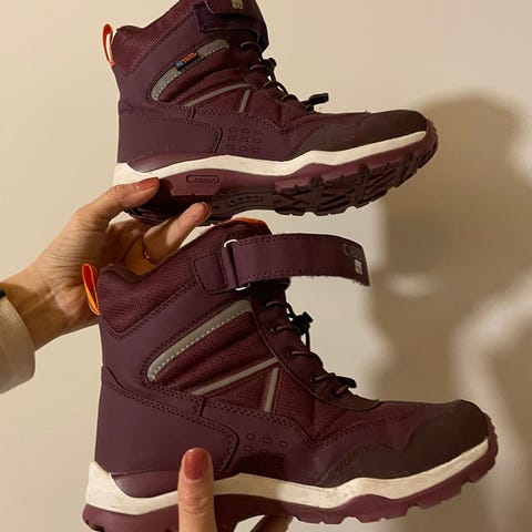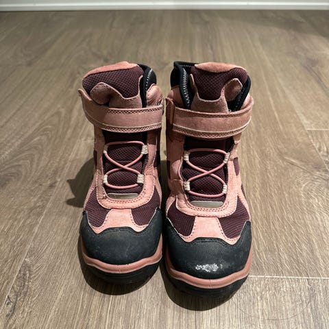 ECCO vintersko for jente i størrelse 36. Skoene har overdel i rosa og mørkere tekstil- og skinnmateriale med forsterkninger på tå og hæl. Grovmønstret yttersåle i gummi gir godt grep. Lukkes med borrelås og elastiske lisser for enkel av- og påtaking. Egnet som varme og robuste vintersko til barn.