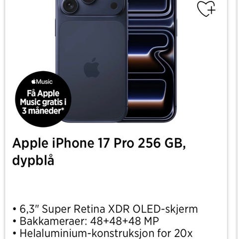 Apple iPhone 17 mobiltelefon med 256 GB lagringsplass. Modellen har berøringsskjerm og støtte for moderne mobilnettverk og apper. Lagringskapasiteten på 256 GB gir plass til apper, bilder, video og andre filer. Egnet som hovedtelefon til daglig bruk, jobb og underholdning.