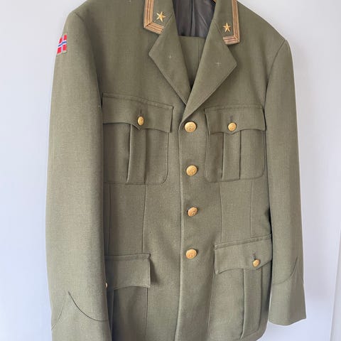 Forsvaret HV uniformsjakke i grønn farge, størrelse 54L. Jakken har skulderklaffer med stjerner, HV-merke på ermet og norsk flagg på motsatt erme. Bukse følger med