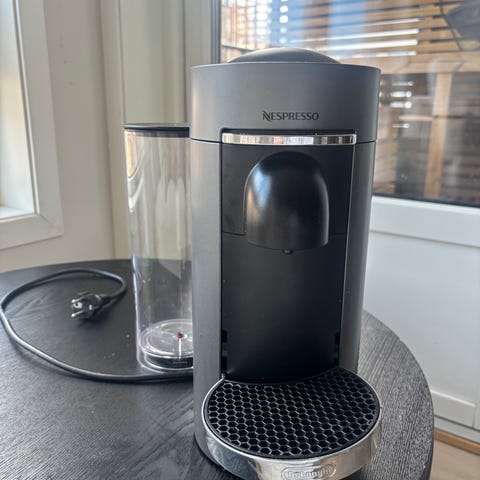 Nespresso Vertuo kaffemaskin med melkeskummer i svart. Maskinen bruker Nespresso Vertuo-kapsler for tilberedning av kaffe og espresso i ulike koppstørrelser. Melkeskummeren kan brukes til å skumme melk til varme eller kalde melkedrikker. Enheten har avtagbart dryppbrett og toppbetjening med knapper. Passer til bruk på kjøkkenbenk eller kontor for enkel tilberedning av kapselbasert kaffe.