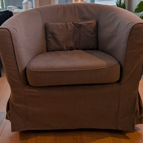 Selger 2 stk nette og fine IKEA lenestol som har gått ut av produksjon. Stolen er opprinnelig i sennepsgult stoff og selges med grått avtagbart trekk som vist på bildet. Trekket er nyvasket og uten synlig merker og bruk. Stolene er ikke nedsittet men fortsatt veldig gode å sitte i