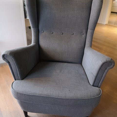 Selger en veldig pent brukt ørelappstol med puff av merke Strandmon fra Ikea. Farge grå.
