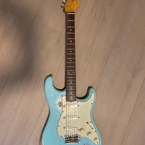 Dette skal være en "special run" for en mindre japansk gitarbutikk i fargen Sherwood Green Metallic med matchende head stock. Den er som ny med plast på plekterbrettet, og ingen dings eller merker.