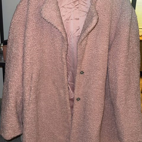 Oversized jakke kåpe fra H&M i størrelse XS. Jakken er rosa og laget i polyester, med myk, teddy-lignende overflate. Den har glidelås foran og hette. Fôret innside i glatt polyesterstoff. Passer som en lett ytterjakke i kjøligere vær