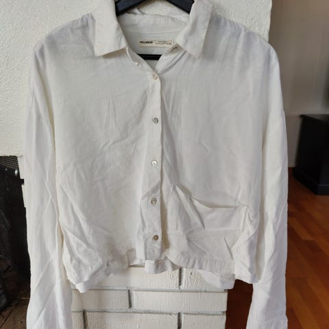 Bershka skjorte for dame i størrelse S. Skjorten er hvit og laget av bomull. Modellen har klassisk krage, knappelukking foran og lang erm. Fronten har brystlomme, og lengden er noe kortere/cropped. Passer til hverdagsbruk eller enkel styling til både bukser og skjørt.