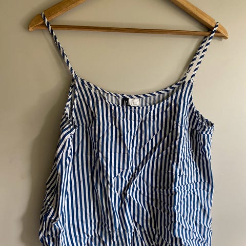 NA-KD singlet for dame i størrelse 36. Toppen har tynne stropper og elastisk parti øverst og i midjen som gir en lett rynket effekt. Den er flerfarget med vertikale striper og er laget i polyester. Passer som sommertopp eller til hverdagsbruk sammen med bukse, shorts eller skjørt.