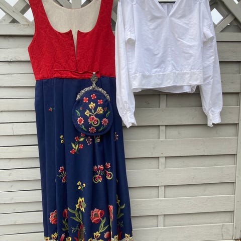 Ca. størrelse M. Total lengde 139 cm. Stakk 92 cm. Brystvidde 90 cm. Midjevidde 84 cm. Linskjorte med broderte detaljer på krage og mansjetter. Jakke i sort. Begge sydd hos Husfliden Lillehammer. Veske, lue, sølv og sko (str. 7) følger med.