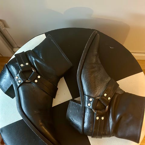 Disse er i mørk grå, ekte skinn og i str. 38. Mange tøffe detaljer, som nagler og spenner. Du ser og føler den gode kvaliteten. Hele og fine, finner ingen feil, kun naturlige bruksmerker som gir kvalitetsboots som disse en fin patina, bruk kler dem! 🤩