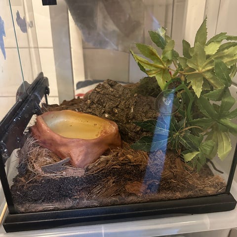 Terrarium med pinnedyr selges for 1500, knappe året gammelt. 30x30x45 cm. Utstyr avbildet kan følge med ved interesse, samt pose med uåpnet spon til bunnen uavbildet. Har også oppheng for evt planter.
