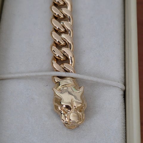 Lite brukt 18K Panser kjede og anheng. Lengde 54cm, bredde 5mm. 13g. 35 000kr.