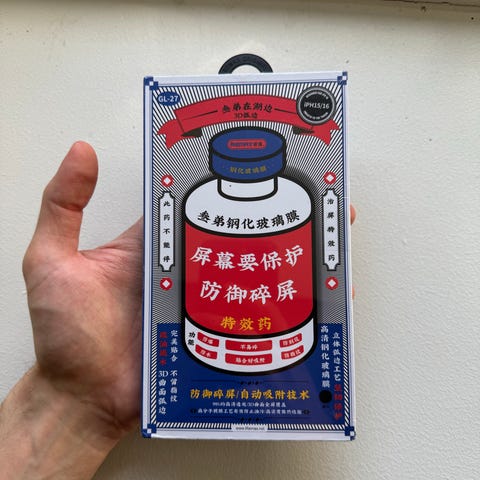iPhone 16e skjerm. Dekselet leveres i eske sammen med rengjøringsservietter for montering.