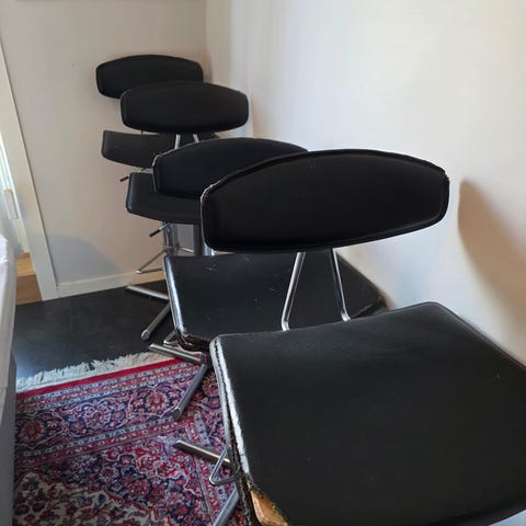 Stolene har metallben og selve ryggstøtten og sitteflaten er skrudd fast i metalldelen. Enkle å stable om sitteflate og ryggstøtte løsnes.