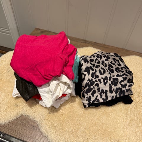 Klespakke i str L, selges for kr 500,-. Pakken inneholder 10 topper. Noen er ubrukte og resten er pent og lite brukt.