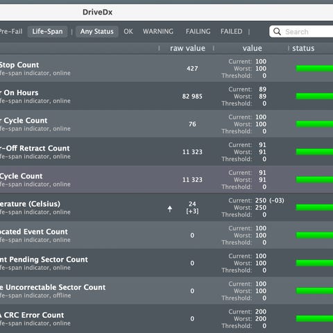 ❯ Plettfri helseattest: Disken er grundig testet med DriveDx (se bilde). Den rapporterer 100 % OK i helsestatus og har 0 feil på kritiske indikatorer.