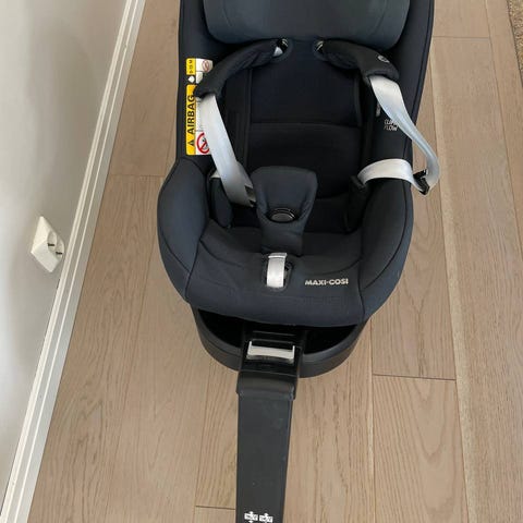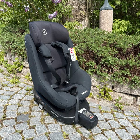 Maxi-Cosi bilstol. Barnesetet har fempunktssele og polstrede skulderremmer. Setet har justerbar rygg og hodestøtte for å tilpasses barnets størrelse. Kan roteres for enklere plassering av barnet. Her sitter barnet trygt og godt.