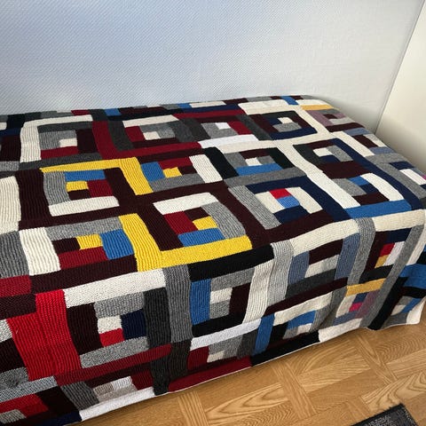 Stripet teppe i flerfargede nyanser av rødt, oransje, svart og hvitt. Teppe med tett vevd mønster i horisontale striper. Passer som gulvteppe eller veggteppe i stue, gang eller andre oppholdsrom.