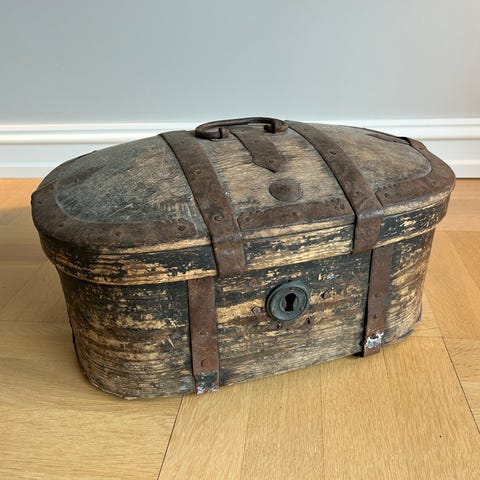 Stikkord: vedkasse, vinkasse, møblement, klenodium, metallkiste, skattekiste, kiste.