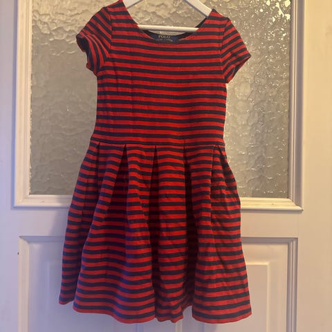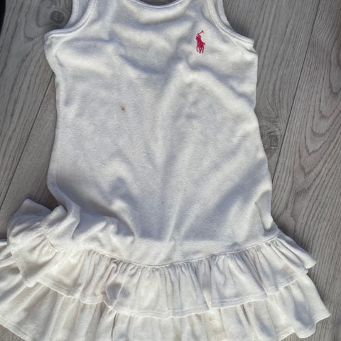 Polo Ralph Lauren kjole for jente i størrelse 116. Kjolen er hvit og laget av bomull. Den har ermeløst snitt og volangkant nederst på skjørtet. På brystet er det et stort Polo Ralph Lauren-logo motiv. Passer til hverdagsbruk eller enklere penere anledninger.