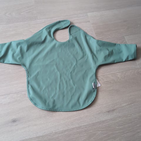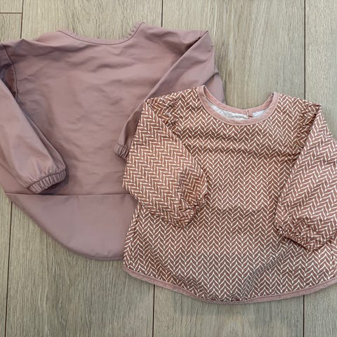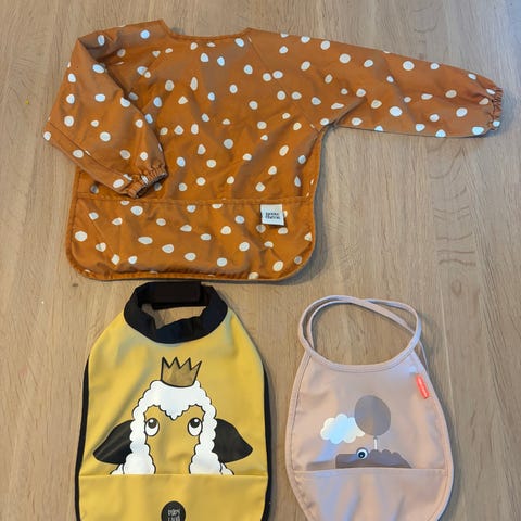 3 smekker med ermer for barn. En med prikker fra Liewood, en med dyremotiv, og en grønn (denne har blitt brukt litt til maling, men mulig malingen går bort i vask).