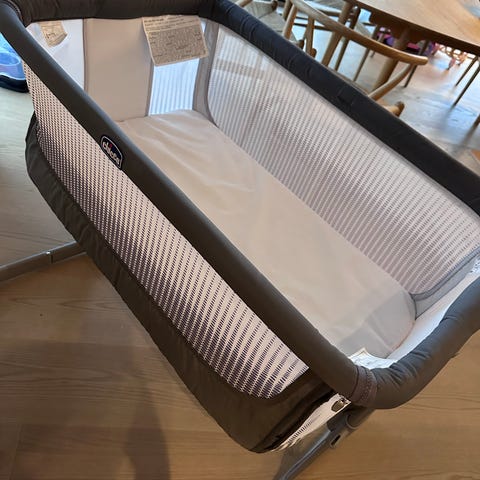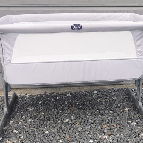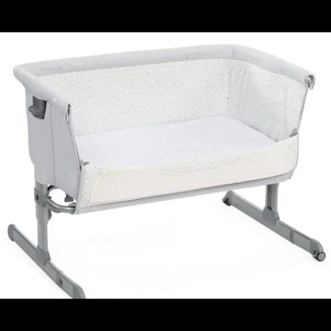 Chicco bedside crib babyseng i grå tekstil. Sengen er beregnet for spedbarn og kan plasseres inntil foreldrenes seng. Høyden på sengen kan justeres i flere trinn for å tilpasses ulike senghøyder.