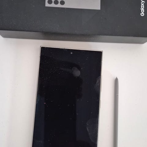 Samsung Galaxy S24 Ultra mobiltelefon med 256 GB intern lagring. Enheten har stor skjerm i front og flere kameraer på baksiden. Telefonen har USB-C-port i bunnen. Passer for brukere som trenger god lagringskapasitet til apper, bilder, video og andre filer.