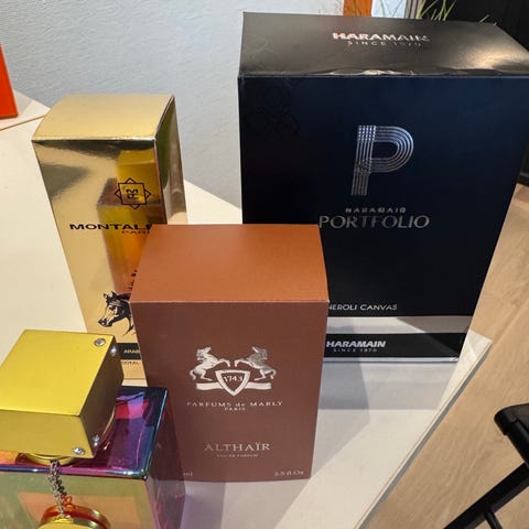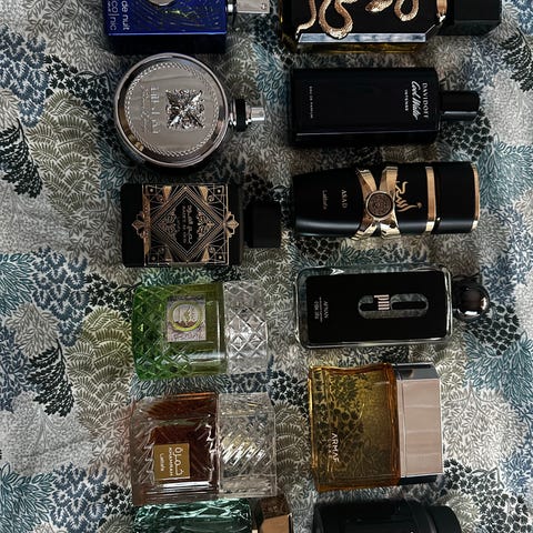 Samling med ulike parfymer for herre og eventuelt unisex. Bildet viser flere forskjellige flasker og merker i ulike størrelser, former og farger. Passer til daglig bruk eller spesielle anledninger. Nøyaktig innhold, merker og mengde per flaske fremgår av bildet og eventuell ytterligere informasjon fra selger.