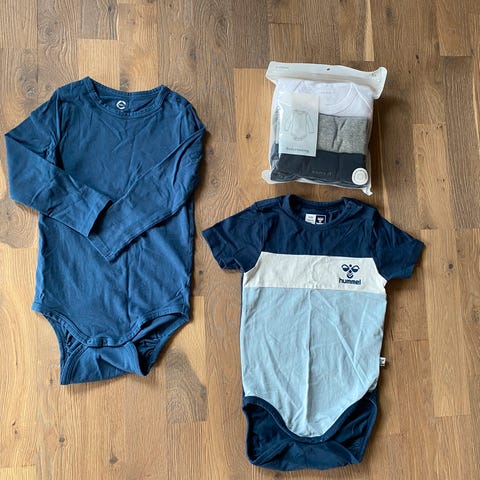Hummel body for gutt i størrelse 92. Langermede bodyer i blåtoner, med karakteristisk Hummel-logo og piler på ermene. Passer til hverdagsbruk for barn rundt størrelse 92. Materiale antas å være myk bomullsblanding basert på utseende, med trykknapper i skrittet for enkel av- og påkledning.