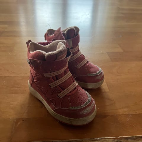 Selger pent brukt Superfit vintersko for jente i størrelse 28. Skoene er mørkerosa med to borrelåsstropper over vristen og print i form av snøkrystaller for enkel justering og av- og påtaking. Skoene har refleksdetaljer. Grovmønstret yttersåle gir godt feste på underlaget. Overdel og innside fremstår som fôret og egnet for bruk i kaldere vær. Passer til hverdagsbruk i høst- og vintersesongen.