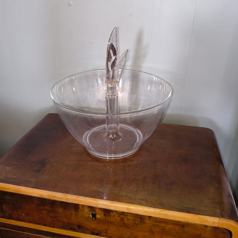 Den har et stativ i midten med plass for tilhørende kniv. Bollen er smart for servering av salat også, eller som bolle for rundstykker. Da er det kjekt å ha kniven tilgjengelig der for å dele rundstykkene.