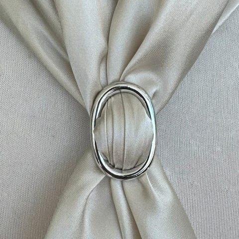 Skjerfring i sølv. Lekkert å style skjerfet med. Skjerfringen er i metall. Den er pent laget, og ser eksklusiv ut. Den kan styles på mange måter. Passer spesielt godt til silkeskjerf. Kan brukes på andre skjerf også, bare skjerfet ikke er for tykt for hullet i skjerfringen. Åpning er 20 mm. Den er ikke tung slik at den sklir på skjerfet.