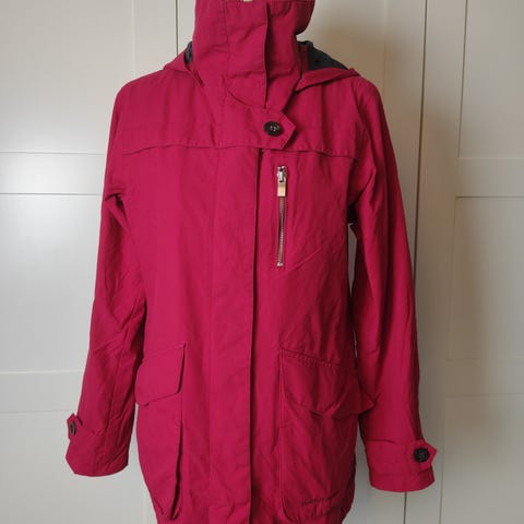 Selges: Klassisk vintage jakke fra Bergans i en markant, klar rød farge. Modellen har en feminin, lett innsvinget passform og rekker til midt på låret – en funksjonell parkasfasong med tydelig friluftspreg.