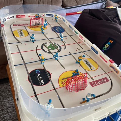 Bordspillet forestiller en ishockeybane med spillere montert på stenger som kan styres manuelt. Banen har trykte reklamelogoer og markeringer som på en ekte ishockeybane. Spillet passer til to spillere som kan styre hvert sitt lag og forsøke å score mål ved å bevege spillerne og skyte pucken i motstanderens mål. Egner seg som innendørs aktivitet for barn og voksne som liker ishockey og bordspill.