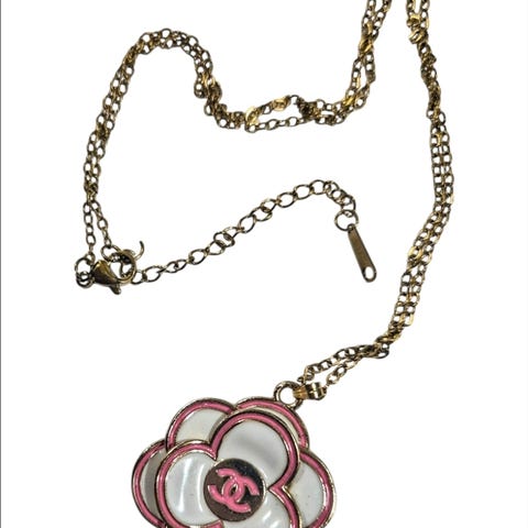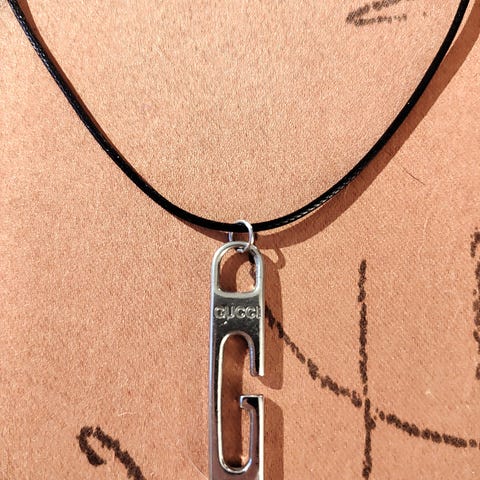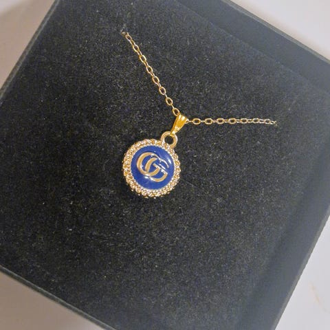 Flott Gucci halskjede i rose- rød/rosa bakgrunn, med gulltoner i rammen og i logo - monogramet i senter GG. Re-designet fra et vintage originalt Gucci anheng, og gjort om til et komplett halskjede! Det er syemplet Gucci på baksiden! Henger på et 18k gullbelagt halskjede i rustfitt stål, med en lengde på 45cm, og en ekstra lenke lengde for å regulere lengden med!